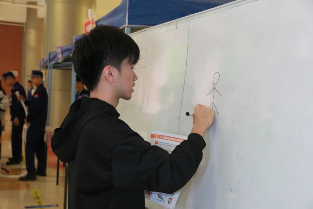 在画险为夷活动中,需要同学们结伴参与,其中,一名同学抽取消防安全题目并画在白板上,另一名同学进行竞猜与回答,同学们在趣味的游戏当中,进一步增强了消防安全意识,加深了同学之间的默契与友谊。